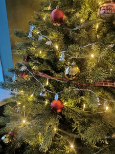 Christmas tree rope, strings of red and gold metalic tinsel.